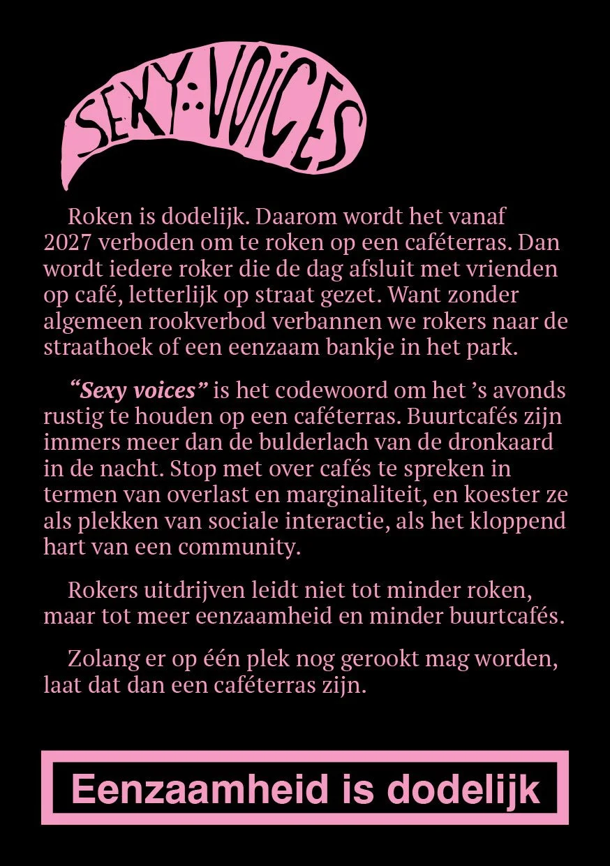 Met deze actie – de sexy-voices-aanstekers – willen we het debat opentrekken. Niet om roken te promoten, maar om te wijzen op het onvermijdelijke neveneffect: de sociale impact van het rookverbod op caféterrassen.